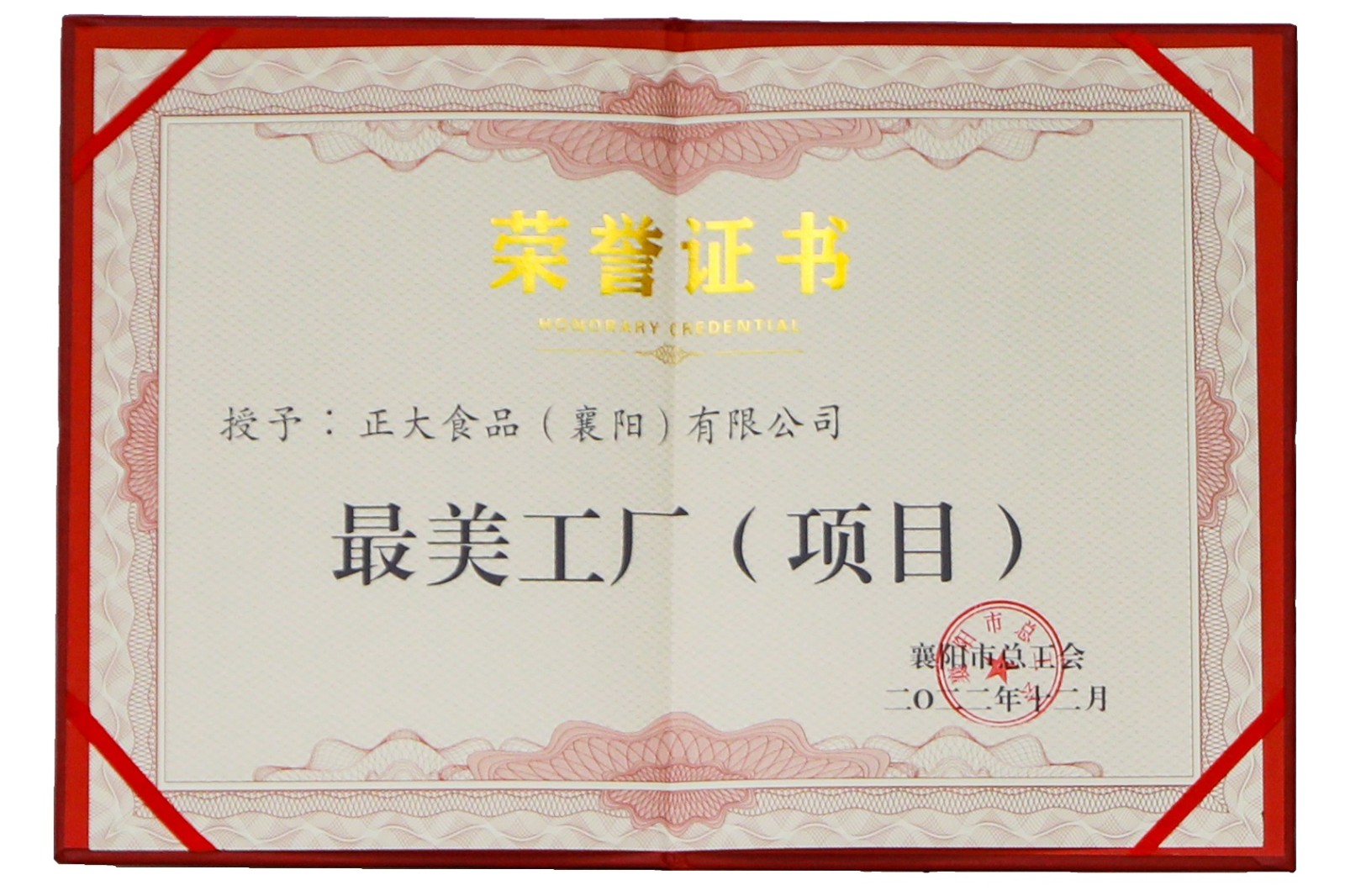 為廣泛開展美好環境與幸福生活共同締造活動,評選為襄陽市經濟社會高質量發展做出積極貢獻的單位和群體及個人,襄陽市總工會開展了尋找襄陽市“最美職工(工匠)、最美工廠(項目)、最美班組(窗口)”的活動。歷時2個月的多輪評定,襄陽市總工會決定授予正大食品(襄陽)有限公司——襄陽市“最美工廠(項目)”獎項。